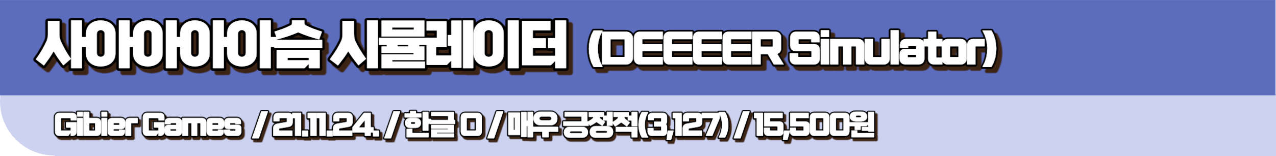 병맛 넘치는 그래픽과 게임플레이가 돋보이는 사아아아아슴 시뮬레이터입니다. 게임이름이 실제로 사아아아아슴, 영어로 디이이이어 시뮬레이터인데요. 플레이어는 사슴이 되어, 기다란 목을 자유자재로 줄이거나 늘여가며 도시를 휘젓고 다닐 수 있는데요. 눈앞에 보이는 모든 것을 파괴해 버릴 수도 있고, 플레이어를 잡기 위해 쫓아오는 다른 동물과 싸워야 하기도 해요. 그야말로 병맛게임이란 이런 것이다를 알 수 있게 해주는 작품인데요. 평가도 나쁘지 않은 작품이니 가볍게 즐겨보시면 좋겠습니다.